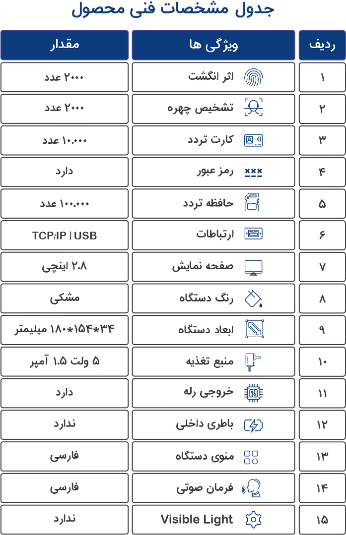 سنسور اثر انگشت این دستگاه با الگوریتم ابتکاری ” تایید شناسایی اثر انگشت”، قوی و ضد خش و ضد دشارژ الکترو استاتیکی بوده و قادر به شناسایی اثر انگشت با کمترین درصد خطا و بدون تقلب در کمتر از یک ثانیه می باشد. در این دستگاه شما می توانید تا 10 اثر انگشت را برای یک شخص تعریف کنید. در این صورت چنانچه انگشت شماره 1 آسیب ببیند، فرد میتواند با انگشت دیگری تردد خود را ثبت کند. بهتر است برای افزایش راندمان حداقل 4 اثر انگشت برای هر یک از پرسنل در دستگاه تعریف شود. سنسور اثر انگشت این دستگاه دارای خاصیت ضد الکترواستاتیکی کاملا ضدخش است و به مرور زمان و در طول استفاده هیچ گونه خط یا خشی را به خود نمی گیرد. این سنسور دارای دو ویژگی منحصر به فرد می باشد: