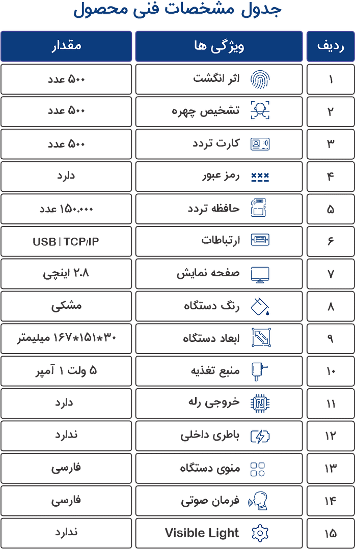دستگاه حضور و غیاب XF20 با توانایی ذخیره 500 اثرانگشت ( قابلیت ذخیره ده اثرانگشت برای هر فرد )، 500 کارت بدون تماس، 500 چهره و 500 رمز عبور، همچنین ضبط و ذخیره 150,000 هزار تردد ، مناسب ادارات کوچک با تعداد پرسنل نسبتا کم میباشد. این دستگاه با ابعاد 167x151x30 میلی متری و وزن 800 گرمی بسیار جمع و جور و کوچک است که میتوان به راحتی بر روی دیوار و یا میز نصب کرد، که رنگ مشکی این دستگاه جلوه زیبایی به محل کار شما میدهد. صفحه نمایشگر دستگاه XF20 در اندازه 2.8 اینج و رنگی طراحی شده که به واسطه چند دکمه که بر روی آن تعبیه شده، دسترسی راحتی را به تنظیمات دستگاه برای شما فراهم کرده است. منو و سخنگوی فارسی دستگاه نیز سرعت دسترسی را بالا برده است. دستگاه XF20 به وسیله برق شهری 5 ولت 1 آمپر تغذیه میشود.